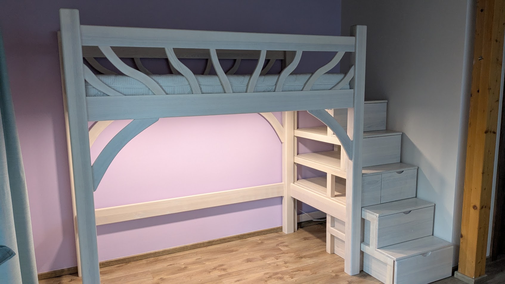 Netradiční vyvýšená postel se schody, celé z jasanu (mořeno bílou transparentní). Schody nabízí šuplíky a police. Postel je podsvícená